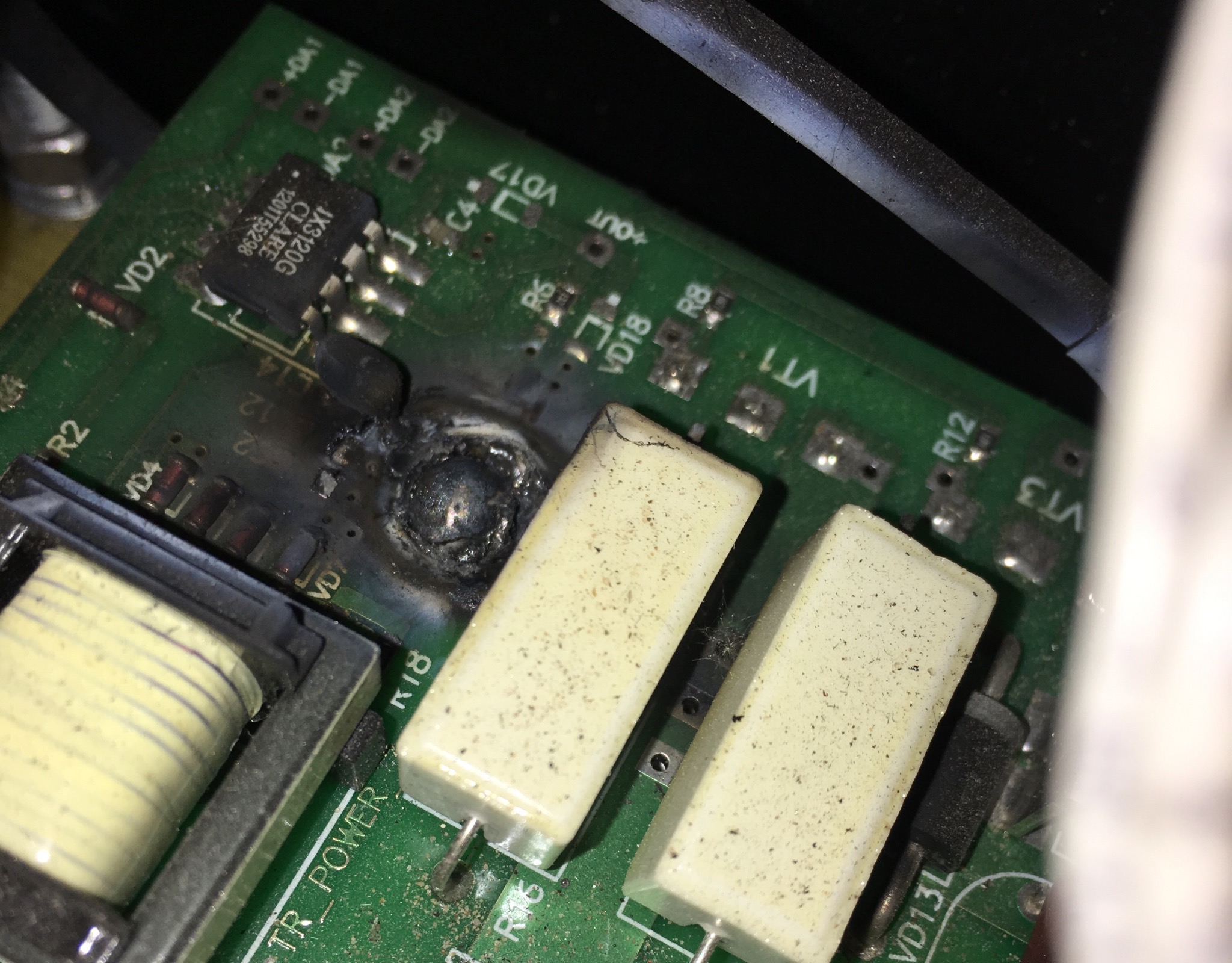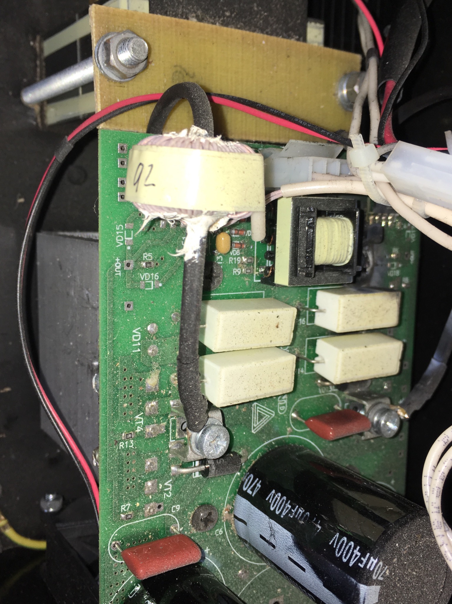 сгорела плата. включил аппарат , после загрузки в режиме ММА внутри заискрилось, был хлопок , в итоге расплавился каким то чудом винт крепления радиатора транзистора.